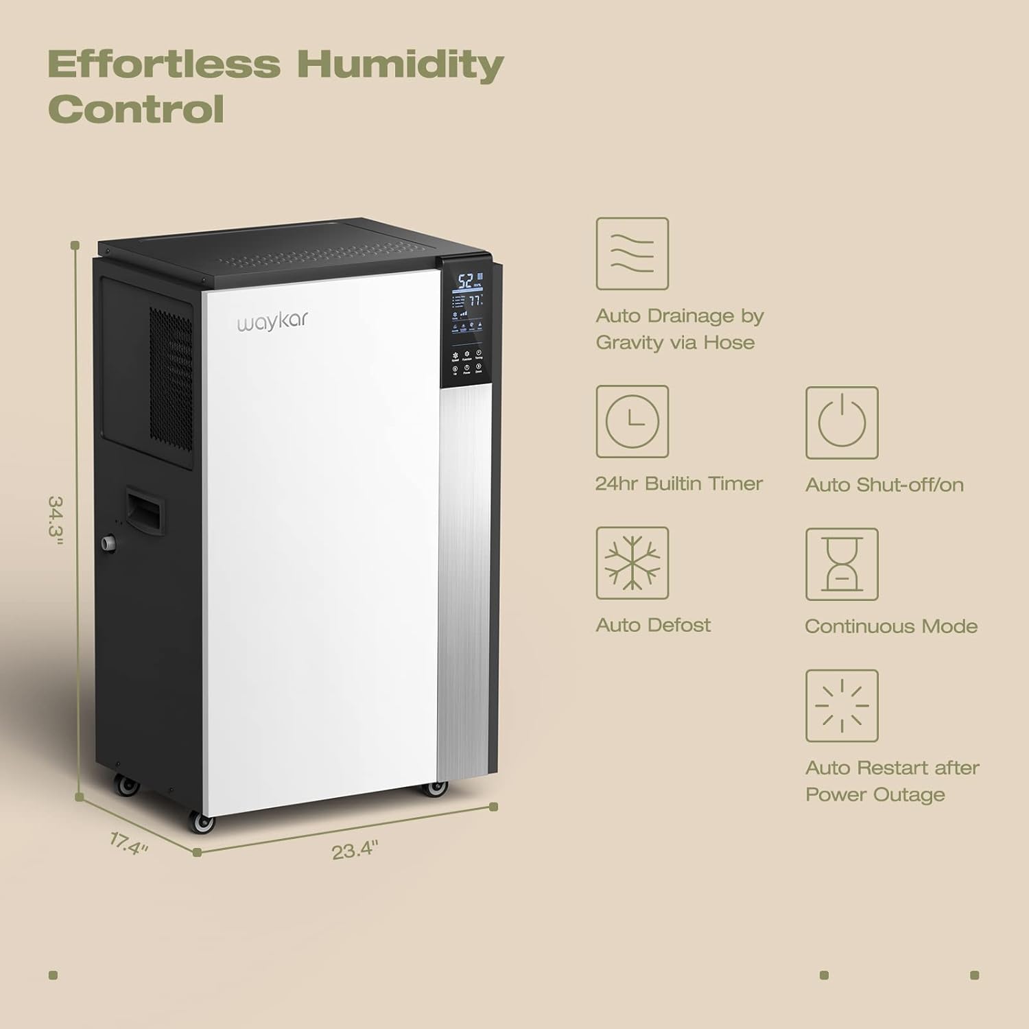 Illustrates the unit's dimensions (34.3" H x 23.4" W x 17.4" D) and highlights features like auto drainage, 24hr timer, auto shut-off/on, auto defrost, continuous mode, and auto restart after power outage.