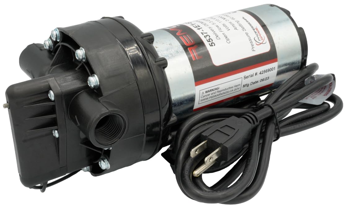 The Remco 5500 Series ProFlo Demand Pump is a robust 5-chamber diaphragm pump designed for demanding applications. It features a sealed 115 VAC electric motor and durable components for long, continuous duty cycles.
