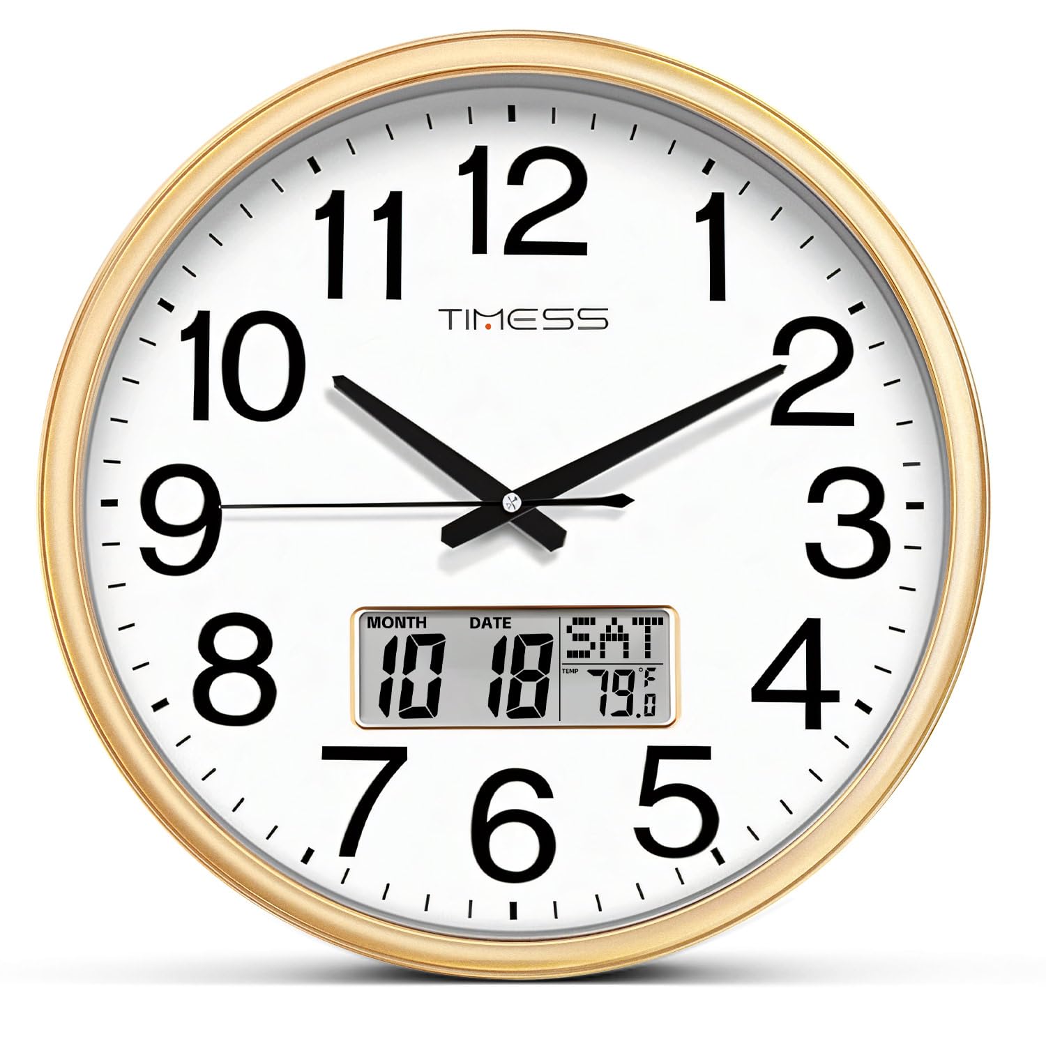 Whakaahua: Mua view of the TIMESS 13-Inch Wall Clock, showcasing the analog dial and the integrated LCD display for date and temperature.